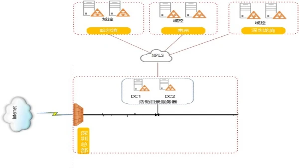 深圳总部作为主站点,配置一台主域控,一台额外域控;龙岗站点部署两台额外域控、南京站点部署两台额外域控、哈尔滨部署两台额外域控